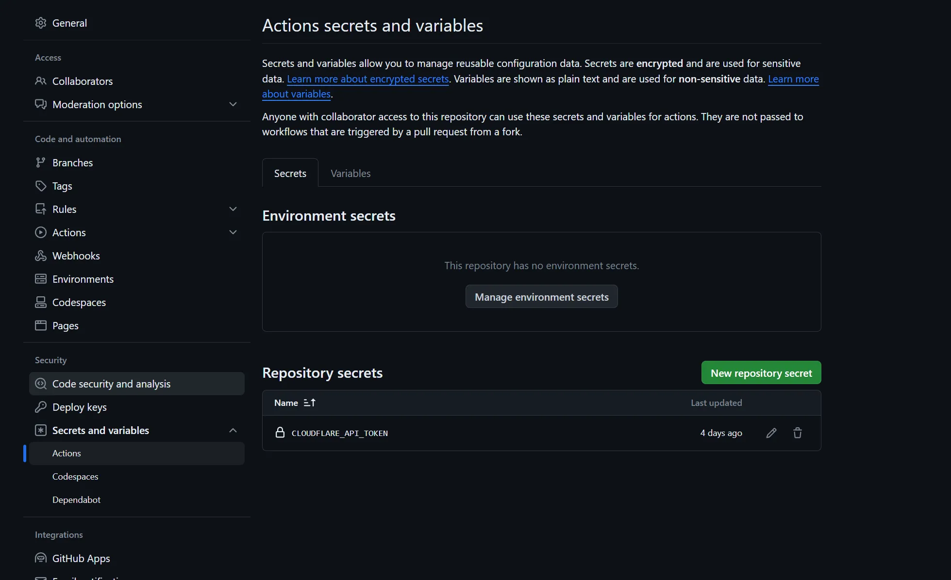 名字命名为CLOUDFLARE_API_TOKEN,内容就是刚刚获取的API Token.